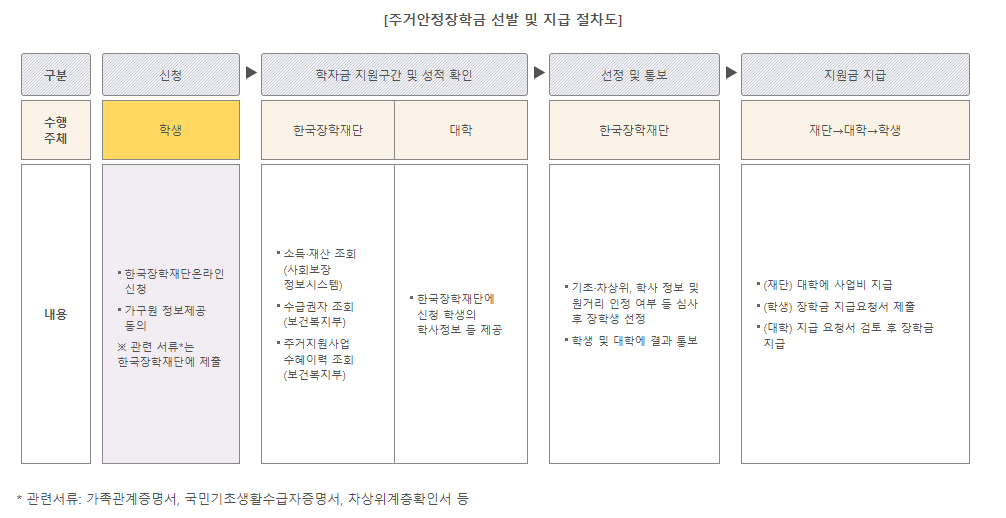 한국장학재단 공식 웹사이트 접속 → 회원가입 및 로그인 → 주거안정장학금 신청 페이지 이동 → 신청서 작성 및 제출 → 필요 서류 업로드 (소득 증빙, 거주지 관련 서류 등) → 신청 완료 후 심사 진행