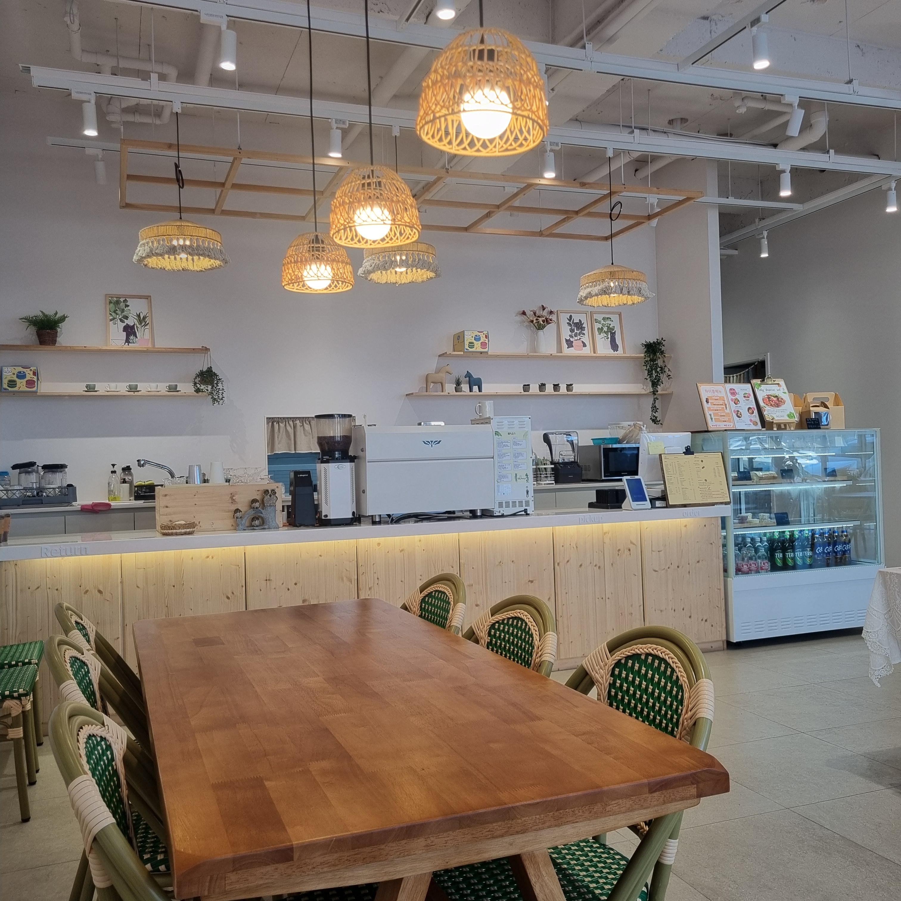 카페에 들어서자마자 따뜻하고 아늑한 분위기가 확 느껴졌어요. 나무 테이블과 의자, 아기자기한 식물들이 공간을 꾸미고 있었고, 천장에서 내려오는 조명이 포근한 느낌을 더해줬어요.