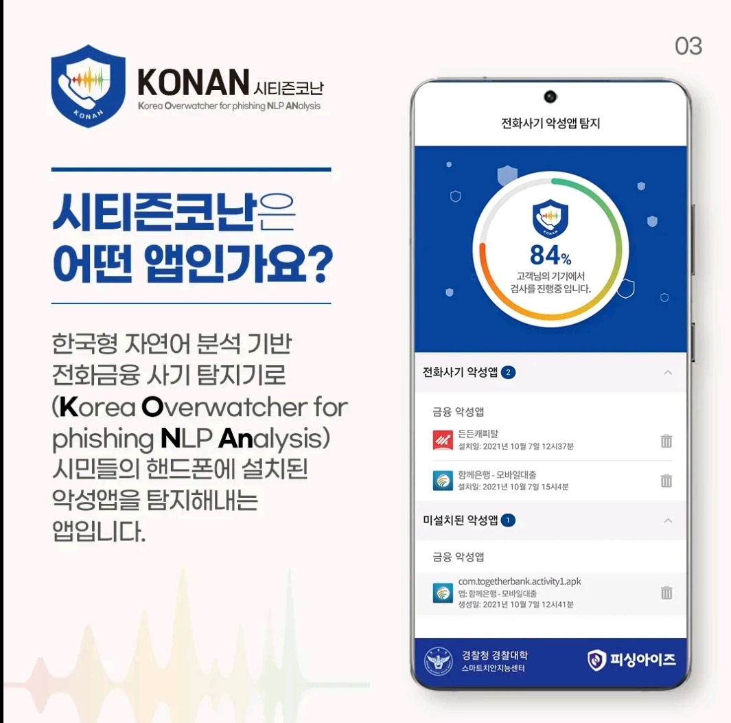 시티즌코난앱은 최신 한국어 자연어 처리(NLP) 기술을 이용하여 피싱 시도나 의심스러운 메시지를 실시간으로 분석하고 탐지하는 기능을 제공합니다. 예를 들어, 사용자가 보이스피싱 전화나 스미싱 메시지를 받았을 때, 앱은 해당 메시지의 내용을 분석하여 사용자에게 위험을 경고합니다. 이 기능은 빠르고 정확하게 위험을 감지하고, 사용자가 속지 않도록 도와줍니다.
