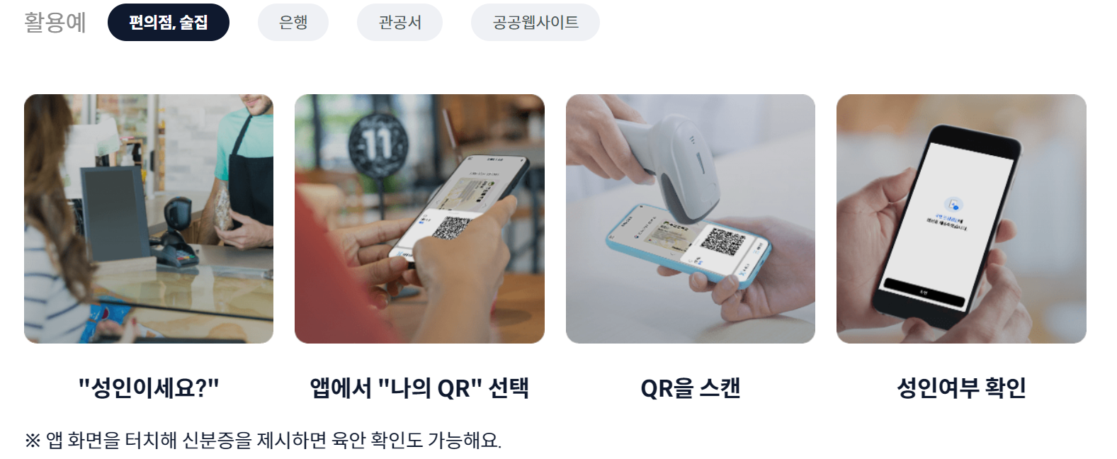 모바일 신분증은 실물 신분증을 사용할 수 있는 모든 곳에서 사용이 가능합니다. 편의점, 술집, 은행, 관공서, 공공웹사이트 뿐만 아니라 신원확인이 필요한 모든곳에서 이용가능합니다.