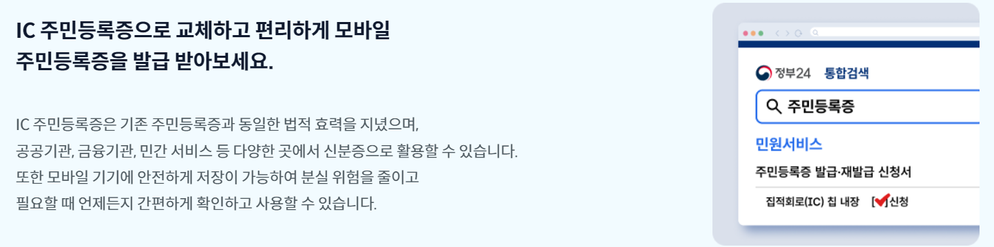 IC 주민등록증 신청: 가까운 주민센터를 방문하여 IC 칩이 내장된 주민등록증을 신청합니다.