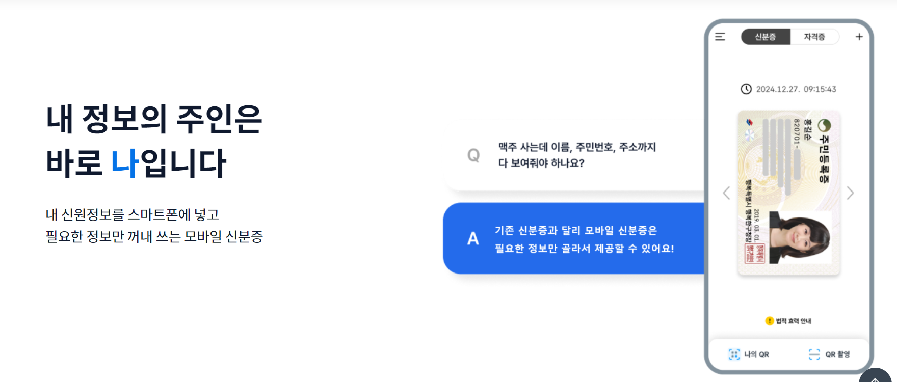 기존의 실물 신분증은 본인의 나이나 특정 정보를 확인할 때도 모든 정보를 노출해야 하는 불편함이 있었습니다. 하지만 모바일 신분증은 본인이 선택한 정보만 제공할 수 있어 개인정보 보호 측면에서도 우수합니다.