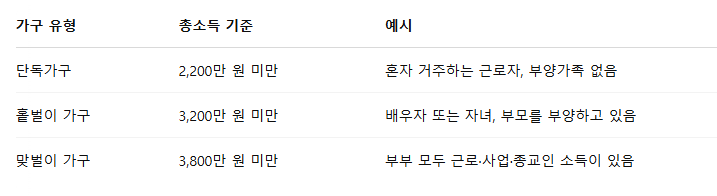 예를 들어, 한 해 동안 근로소득이 1,800만 원이고, 부양 가족이 없는 30대 직장인은 단독가구로 분류되며, 신청 자격이 됩니다.